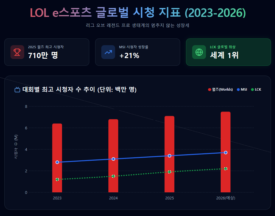 2023년부터 2026년까지의 글로벌 LOL e스포츠 시청 지표는 매년 최고치를 경신하며 강력한 성장세를 보여줍니다. 월즈(Worlds)는 2025년 710만 명의 최고 시청자를 기록하며 압도적 위상을 지켰고, MSI와 LCK 역시 견고한 상승 곡선을 그리고 있습니다. 특히 LCK는 국내 리그임에도 글로벌 팬덤의 열띤 호응에 힘입어 누적 시청 시간 세계 1위를 달성하며 전 세계 e스포츠 시장의 명실상부한 중심임을 입증했습니다.